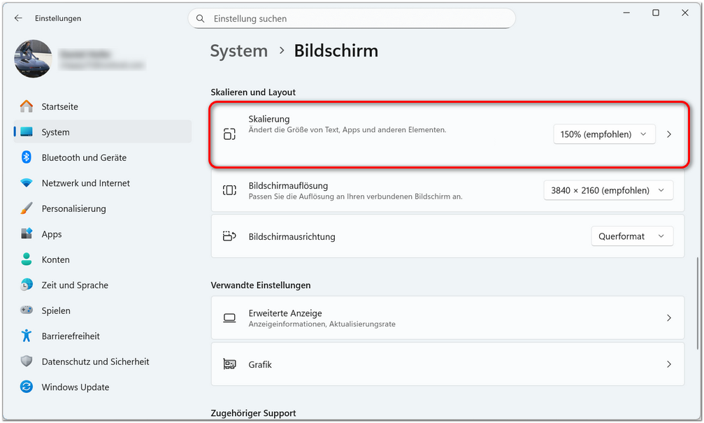 - Beträgt dei Bildschirmauflösung 3840×2160 oder ähnlich, dann auch 200% oder höher Sinn machen